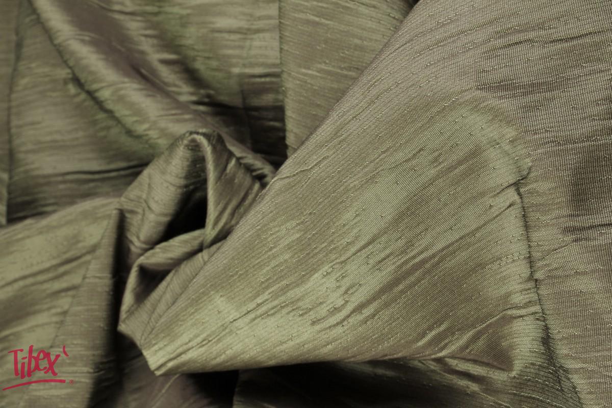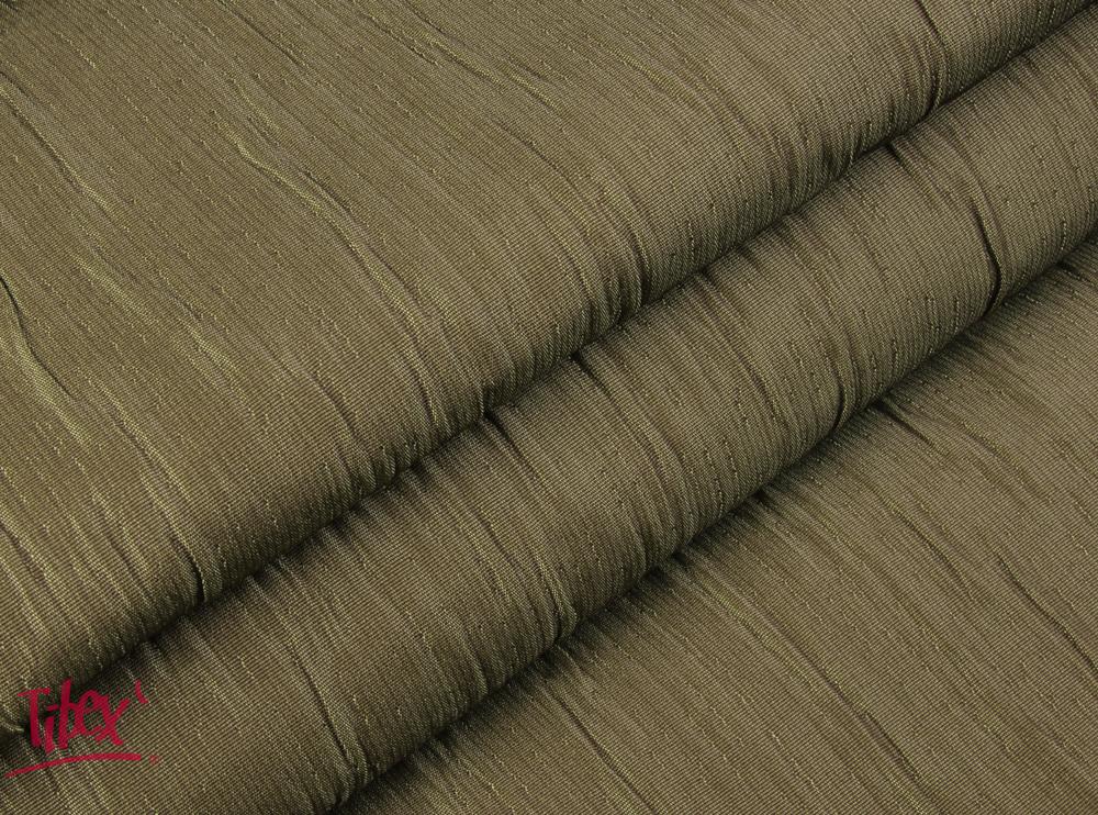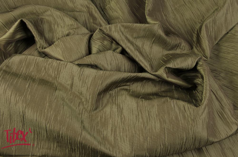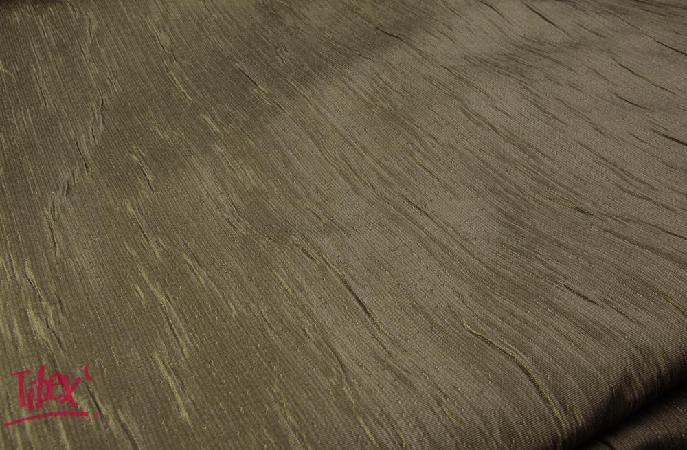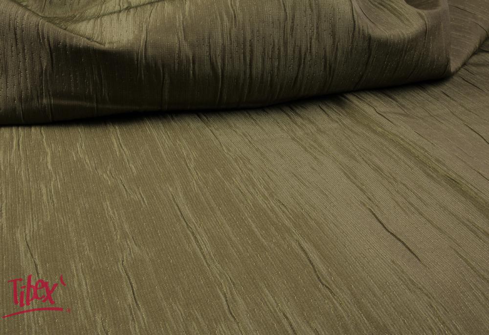 Dekorační látka TAFETAN GLITTER je dvouvrstvá látka tmavě zelené barvy s nepravidelným vzorem mačkaných skladů v osnově s celoplošným leskem. Celkově právě díky lesku působí jako tmavě zelená s nádechem do hnědé. Má velmi pevnou vazbu, díky které lze látku použít na dekorační závěsy nebo přehozy, dekorační polštářky a další podobné designové dekorační prvky. Je ze směsového materiálu, tedy ze 48% polyesteru, 26% bavlny a 26% polyakrylu, v šíři 280 cm.